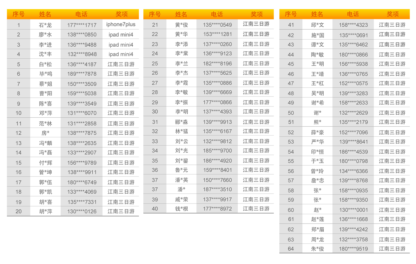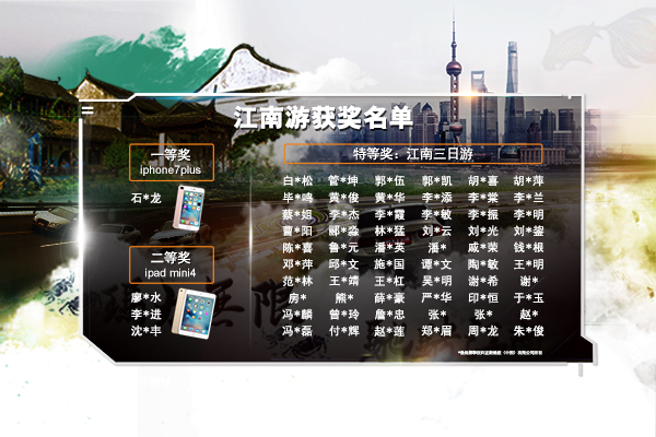 截止9月30日,瑪吉斯輪胎為消費者量身定制此次“江南游”活動也迎來了尾聲,經后臺統(tǒng)計共計3455人參加,其中有效參與達2000余人。十一黃金周過后,工作人員也于系統(tǒng)后臺公平公正抽選出特等獎60名、一等獎1名、二等獎3名及幸運獎100名,現(xiàn)公布獲獎名單如下: